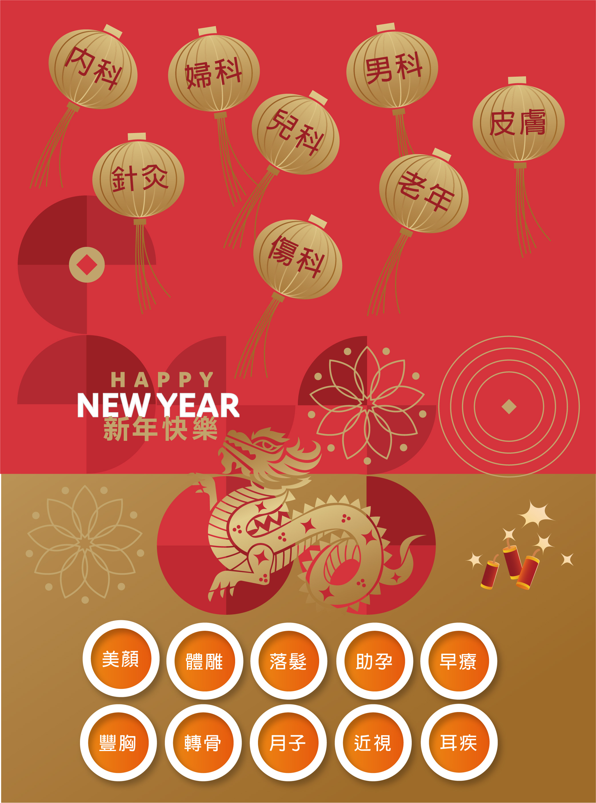 中醫內科、 中醫婦科、體重控制、兒童成長、中醫小兒科、 中醫醫學美容、 老年醫學、 運動醫學、 針灸科、 中醫骨傷科、 中醫皮膚科、 中醫癌症整合治療、 中醫健康管理